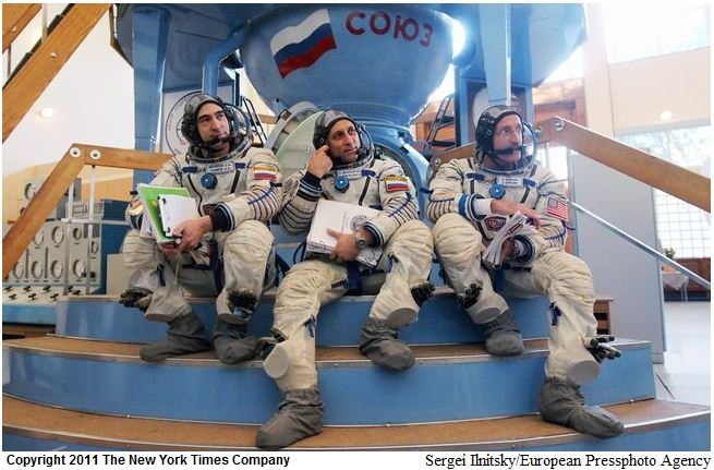 Ένας Αμερικανός ο Daniel C. Burbank, δεξιά και δυο Ρώσοι ο Anton N. Shkaplerov, στο κέντρο, και ο Anatoly A. Ivanishin, αναχωρούν την Δευτέρα με προορισμό τον Διεθνή Διαστημικό Σταθμό