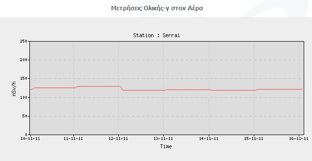 σταθμών που καταγράφουν το ρυθμό δόσης της ολικής γ-ακτινοβολίας στον αέρα (οι σταθμοί αυτοί βασίζονται στην ανίχνευση φωτονίων στη ενεργειακή περιοχή από 50 keV έως 10 MeV για ρυθμούς δόσης από 10 nSv/h έως 1 mSv/h), δεν φαίνεται να υπάρχει ανησυχία για την Ελλάδα. Ο σταθμός που δείχνει τις μεγαλύτερες ενδείξεις – σχετικά με τους υπόλοιπους – είναι ο σταθμός των Σερρών…