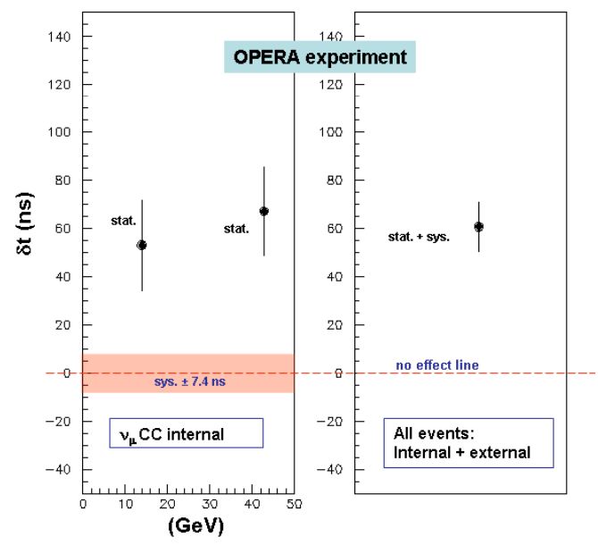 Και στις δύο αυτές περιπτώσεις, οι ερευνητές του πειράματος OPERA στο εργαστήριο του Γκραν Σάσο, νότια της Ρώμης, διαπίστωσαν ότι οι δέσμες νετρίνων που εξέπεμψε το CERN έφτασαν στο εργαστήριό τους 60 νανοδευτερόλεπτα νωρίτερα από ό,τι θα είχε φτάσει το φως.