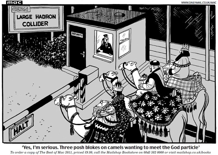 Ένας φυσικός στοιχειωδών σωματιδίων δήλωσε πρόσφατα πως «όταν ακούω να μιλάνε για το σωματίδιο του Θεού θέλω να τραβήξω περίστροφο!». Η επόμενη γελοιογραφία αναφέρεται σ’ αυτό το παντελώς άσχετο παρατσούκλι του σωματιδίου Higgs