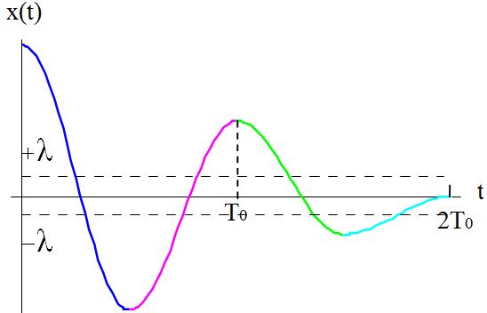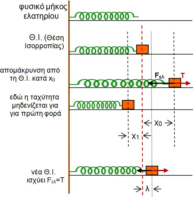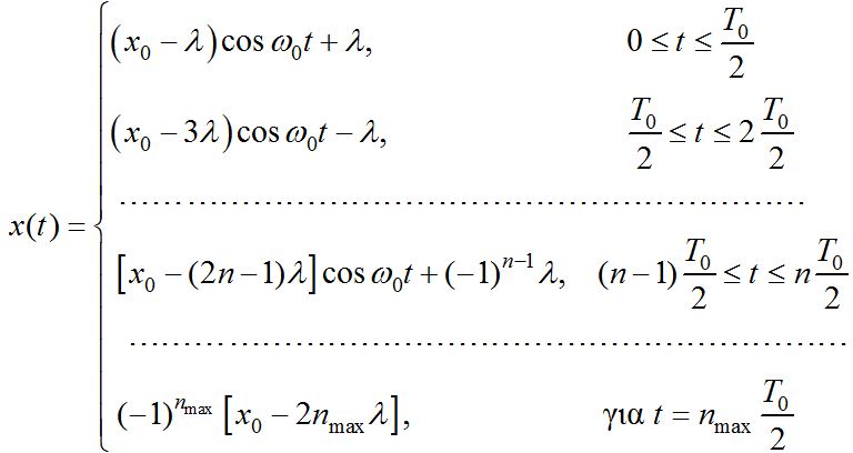 Η αρχική θέση και η θέση στην οποία το σώμα σταματάει για πρώτη φορά είναι συμμετρικές ως προς τη νέα θέση ισορροπίας. Μπορούμε έτσι να ξεχάσουμε για λίγο την φθίνουσα ταλάντωση και να φανταστούμε ότι το σώμα εκτελεί απλή αρμονική ταλάντωση γύρω από τη νέα θέση ισορροπίας με πλάτος, x0 – λ, και περίοδο