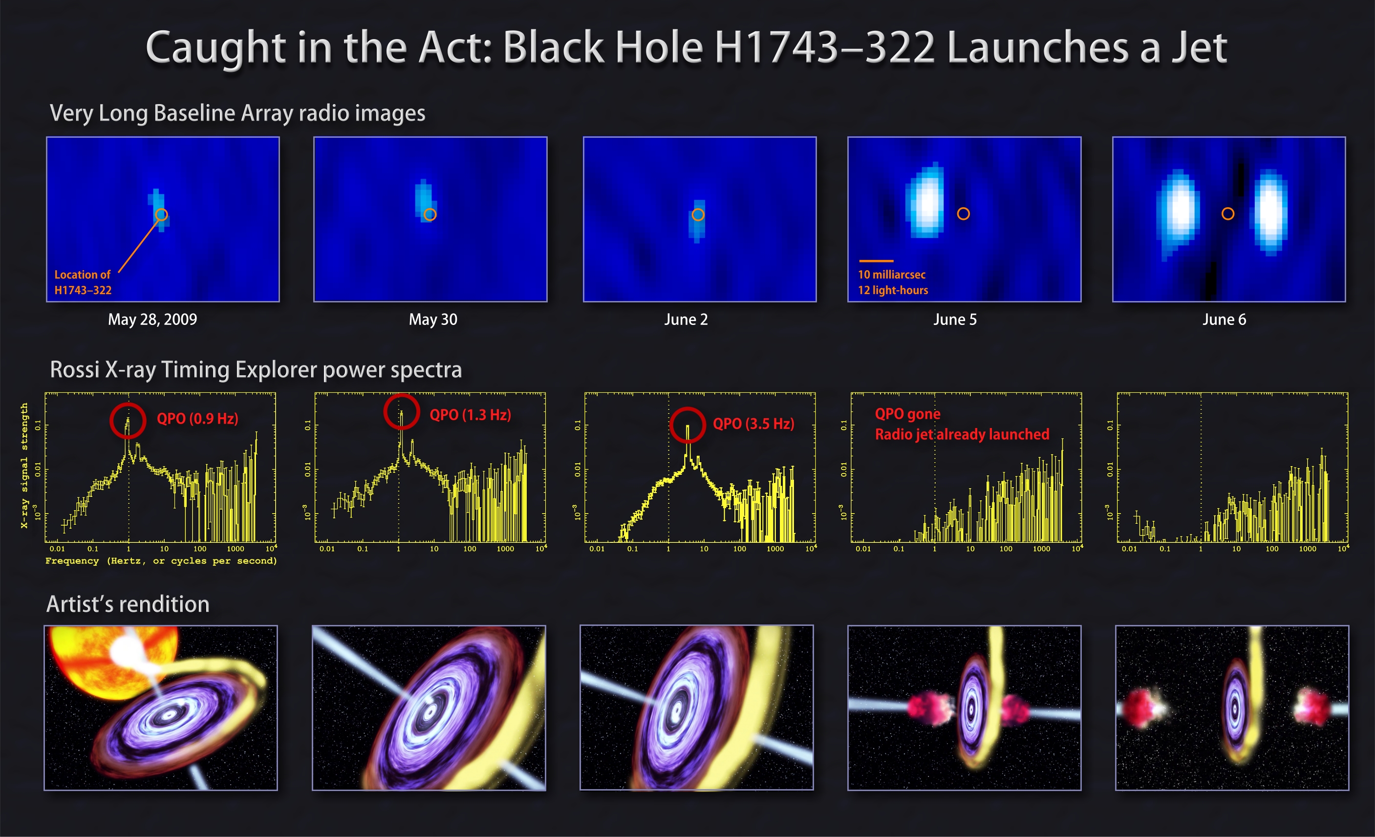 Στην πάνω σειρά βλέπουμε την απεικόνιση από το ραδιοτηλεσκόπιο Very Long Baseline Array, στην ενδιάμεση σειρά βλέπουμε τις ταυτόχρονες παρατηρήσεις ακτίνων Χ από τον δορυφόρο RXTE , και στην τελευταία σειρά τα αντίστοιχα στιγμιότυπα της εκτόξευσης των "σφαιρών" τεράστιας μάζας αερίου από την μαύρη τρύπα, όπως αναπαρίστανται στο βίντεο παρακάτω.
