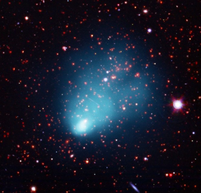 Οι αστρονόμοι, που έκαναν τη σχετική ανακοίνωση στο συνέδριο της Αμερικανικής Αστρονομικής Εταιρίας στο Τέξας, σύμφωνα με το BBC, δήλωσαν ότι το σμήνος βρίσκεται σε φάση βίαιης συγχώνευσης με ένα άλλο και άρα θα μεγαλώσει ακόμα περισσότερο. Οι συγχωνεύσεις σμηνών γαλαξιών θεωρούνται τα πιο κολοσσιαία φαινόμενα στο σύμπαν, καθώς ασύλληπτα μεγάλες ποσότητες ορατής και σκοτεινής ύλης συγκρούονται μεταξύ τους με τρομακτική ταχύτητα πολλών εκατομμυρίων χιλιομέτρων την ώρα, παράγοντας τεράστιες ποσότητες ενέργειας. Η όλη διαδικασία θεωρείται ότι ελέγχεται από τη δύναμη της βαρύτητας.