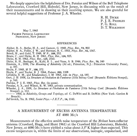 To άρθρο των Penzias – Wilson στο Astrophysical Journal με τίτλο «Α measurement of excess antenna temperature at 4080 Mc/s» για το οποίο τιμήθηκαν με το βραβείο Νόμπελ. Ακριβώς πάνω απ’ αυτό οι Dicke et al δημοσίευαν το δικό τους άρθρο στο οποίο «προέβλεπαν» την θερμοκρασία μικροκυματικής ακτινοβολίας στα πλάισια της θεωρίας της μεγάλης έκρηξης (χωρίς καμία αναφορά στον Gamow!)