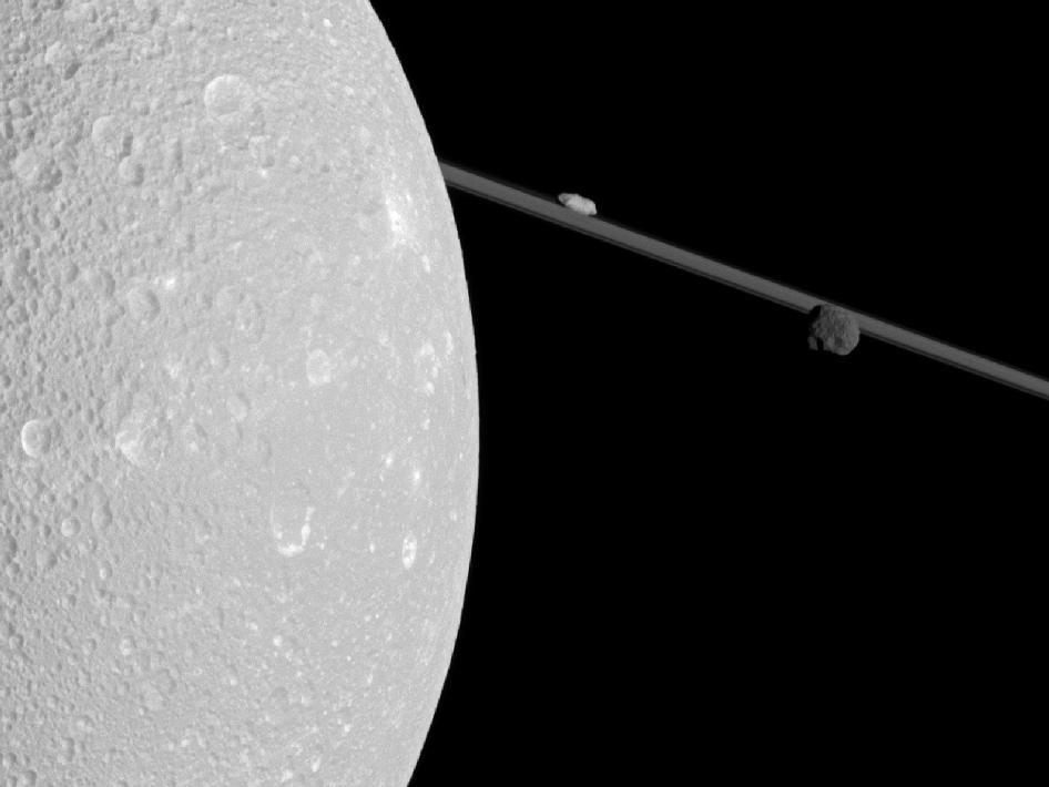 Σ’ αυτή τη φωτογραφία από το διαστημικό σκάφος της NASA Cassini, βλέπουμε τον δορυφόρο του Κρόνου Διώνη (με διάμετρο περίπου 1123 χιλιόμετρα), μαζί με δυο μικρότερους δορυφόρους, τον Επιμηθέα και τον Προμηθέα, κοντά στους δακτύλιους του πλανήτη.