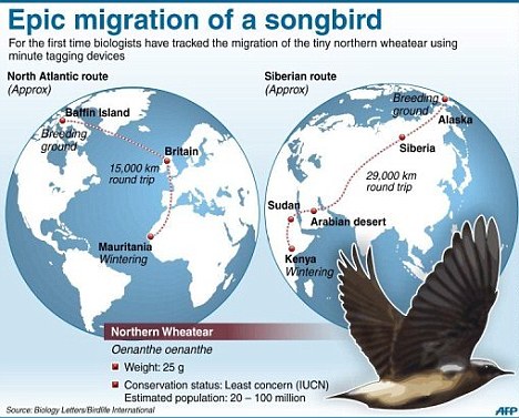 O σταχτοπετροκλής (Oenanthe oenanthe), με βάρος γύρω στα 25 γραμμάρια, περνά το καλοκαίρι τρώγοντας έντομα και ανατρέφοντας τα μικρά του στην τούνδρα του Βορείου Ημισφαιρίου, από τη Σιβηρία μέχρι την Αλάσκα. Όταν έρθει το φθινόπωρο, πετά περίπου 14.500 χιλιόμετρα μέχρι την Αφρική.