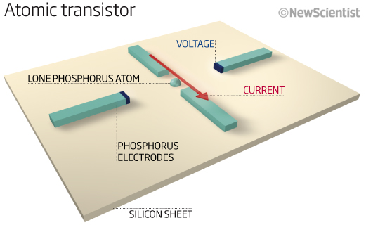 Το μικρότερο τρανζίστορ στον κόσμο αποτελείται από ένα μόνο άτομο φωσφόρου ενσωματωμένο σε ένα κρύσταλλο πυριτίου. Το μικροσκοπικό τρανζίστορ έχει πύλες χαραγμένες στην επιφάνειά του, έτσι ώστε να είναι δυνατή η σύνδεσή του με μεταλλικές επαφές για να εφαρμόζεται η κατάλληλη ηλεκτρική τάση. Ο χειρισμός του ατόμου φωσφόρου γίνεται με ηλεκτρονικό μικροσκόπιο σε θάλαμο κενού.