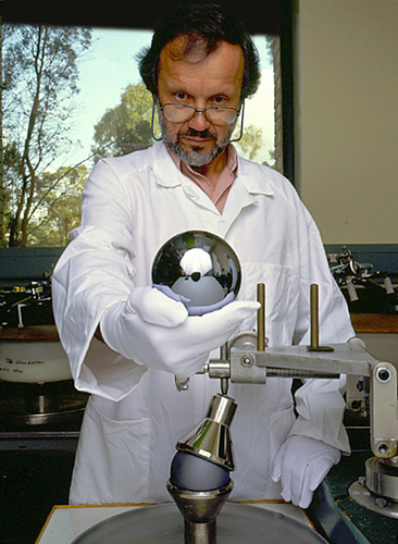 Οπτικός του Αυστραλιανού Κέντρου Οπτικών Ακριβείας (ACPO) επιδεικνύει τη σφαίρα πυριτίου που προτείνει να υποκαταστήσει το νυν μεταλλικό κιλό