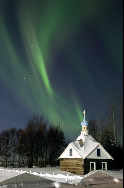 Το Βόρειο Σέλας στον ουρανό πάνω από τη Ρωσική Ορθόδοξη του Αγίου Νικολάου στην Αλάσκα (Peninsula Clarion, M. Scott Moon/AP)
