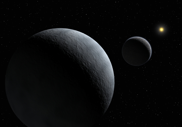 Καλλιτεχνική απεικόνιση του Πλούτωνα και του δορυφόρου του Χάροντα. Στο βάθος φαίνεται ο Ήλιος – πάρα πολύ μεγαλύτερος απ’ ότι την πραγματικότητα.