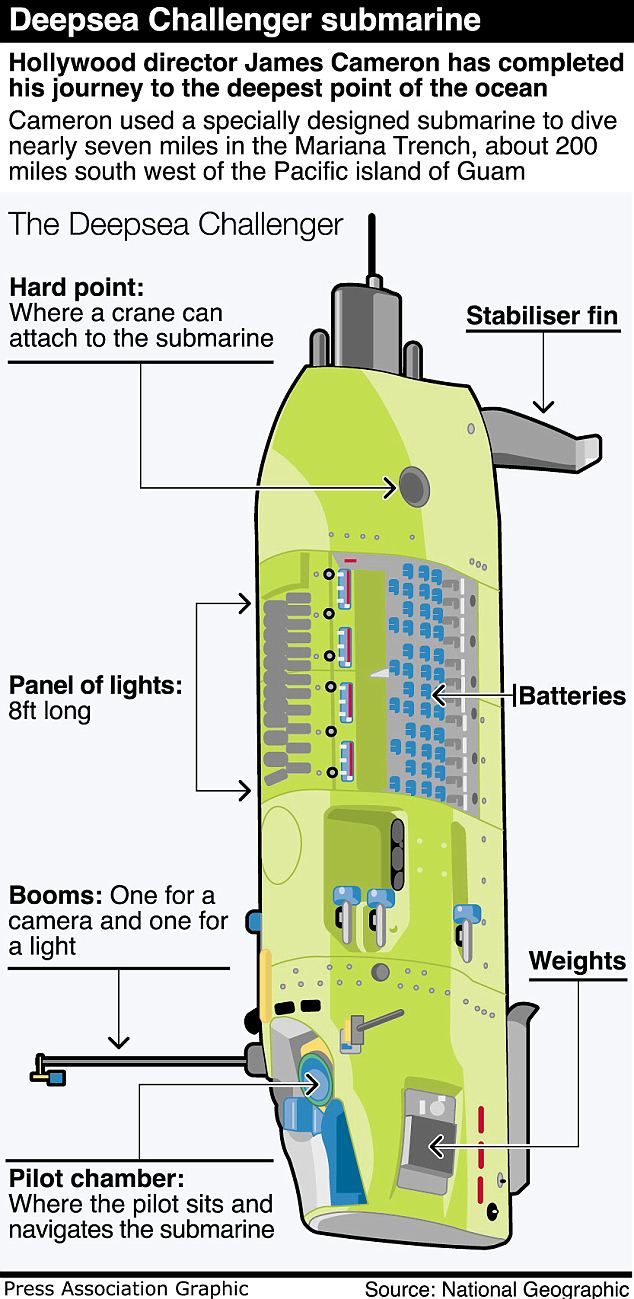 Η κατάβαση με το ειδικά κατασκευασμένο υποβρύχιο Deepsea Challenge διήρκεσε 2 ώρες.