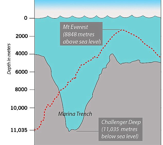 Η Τάφρος των Μαριανών. Η κόκκινη διακεκομμένη γραμμή μας δείχνει ότι η υψηλότερη κορυφή του κόσμου, το Έβερεστ των Ιμαλαίων χωράει και περισσεύει στο βαθύτερο σημείο των ωκεανών