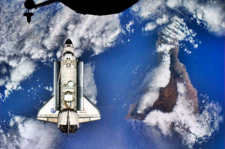 Το διαστημικό λεωφορείο Ατλαντίς ίπταται πάνω από την Τενερίφη, των Καναρίων νησιών, καθώς ετοιμάζεται να προσδεθεί στον Διεθνή Διαστημικό Σταθμό. Υπάρχει μια κάποια ομοιότητα μεταξύ διαστημικού λεωφορείου και Τενερίφης. Η φωτογραφία αυτή είναι σημαδιακή για όσους πιστεύουν ότι η χαμένη ήπειρος της Ατλαντίδας βρίσκονταν στις Κανάριες νήσους….