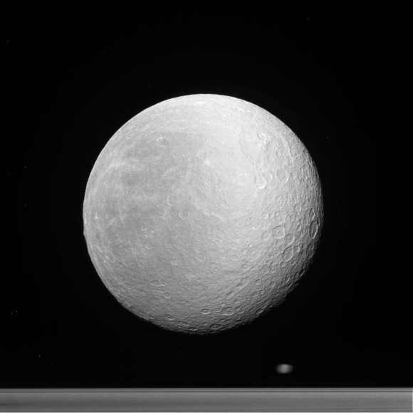 Το δεύτερο μεγαλύτερο φεγγάρι του Κρόνου, η Ρέα, μπροστά από τους δακτυλίους του. Φαίνεται επίσης θολά ο Επιμηθέας ή ο Ιανός (29 Μαρτίου 2012)