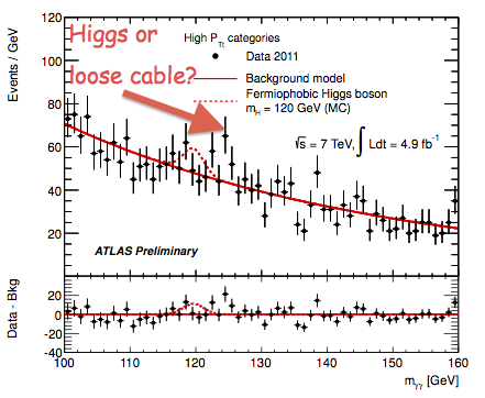 Τις τελευταίες δυο ημέρες το CERN περνάει τις πιο δύσκολες στιγμές από την ίδρυση του. Τα εντυπωσιακά αποτελέσματα που ανακοινώθηκαν τους τελευταίους μήνες σχετικά με την ανίχνευση του μποζονίου Higgs βρίσκονται στον αέρα. Είναι πλέον πολύ πιθανό τα αποτελέσματα αυτά να οφείλονται στις κακές συνδέσεις των καλωδίων των ανιχνευτών. Πρόκειται για παρόμοια καλώδια που χρησιμοποιήθηκαν στο πείραμα OPERA και εξαιτίας των οποίων προκλήθηκε το σφάλμα στη μέτρηση της ταχύτητας των νετρίνων , δημιουργώντας την εντύπωση ότι τα νετρίνα κινούνται με ταχύτητες μεγαλύτερες του φωτός. Ήδη οι ερευνητές των ομάδων ATLAS και CMS κάνουν εξονυχιστικούς ελέγχους σε όλα τα καλώδια, μια εργασία που πρόκειται να διαρκέσει μήνες.