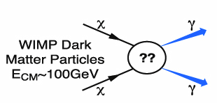 H εξαίρεση στον κανόνα αυτό αποτελεί το γεγονός ότι σύμφωνα με θεωρητικά μοντέλα η σκοτεινή ύλη μπορεί να παράγει μια μονοχρωματική γραμμή φωτονίων. Γνωρίζουμε ότι τα περισσότερα κοσμικά φαινόμενα παράγουν ένα συνεχές φάσμα φωτονίων. Από την άλλη πλευρά, μια γραμμή ακτίνων γάμα μπορεί εύκολα να παραχθεί από την εξαΰλωση σωματιδίων σκοτεινής ύλης (Weakly Interacting Massive Particles – WIMPs) στο γαλαξιακό κέντρο.