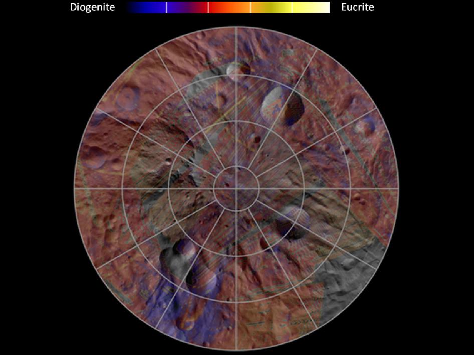 H κατανομή των ορυκτών στο νότιο ημισφαίριο του τεράστιου αστεροειδή Vesta. Οι περιοχές με μοβ χρώμα έχουν υψηλότερο ποσοστό σε διογενίτες (πυριτικά πετρώματα με περισσότερο μαγνήσιο) και οι κίτρινες περιοχές περιέχουν ένα υψηλότερο ποσοστό σε ευκρίτες (πυριτικά πετρώματα πλούσια σε σίδηρο)