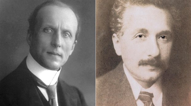 Αριστερά, ο Καραθεοδωρή την εποχή που ήταν καθηγητής στο Πανεπιστήμιο του Γκέτινγκεν. Δεξιά, νεαρός ο Αϊνστάιν, την εποχή που γνωρίστηκε με τον Καραθεοδωρή.