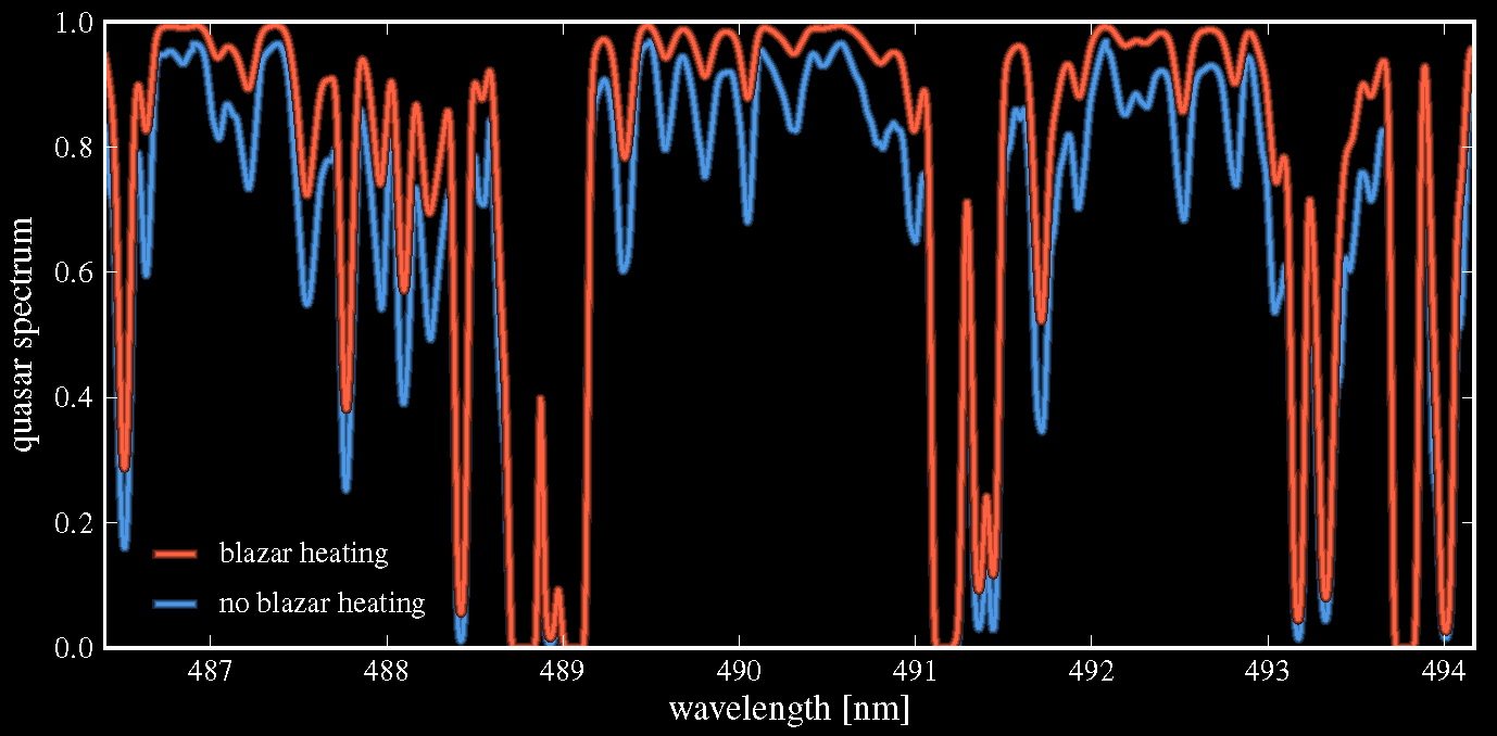To μπλε φάσμα του σχήματος αντιπροσωπεύει ένα σύμπαν χωρίς θέρμανση blazar και το κόκκινο ένα σύμπαν με θέρμανση blazar