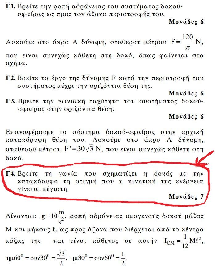«Βρείτε τη γωνία που σχηματίζει η δοκός με την κατακόρυφο τη στιγμή που η κινητική της ενέργεια γίνεται μέγιστη ΓΙΑ ΠΡΩΤΗ ΦΟΡΑ»