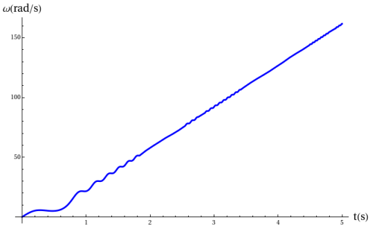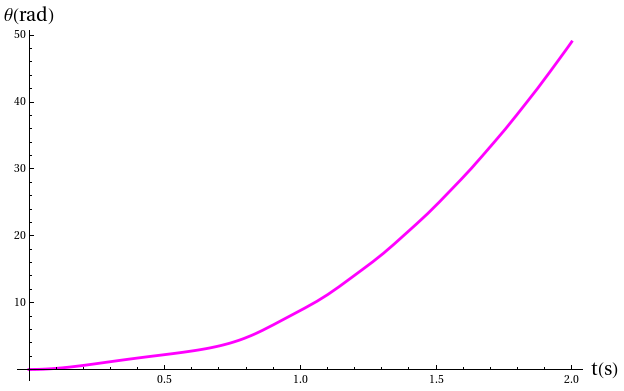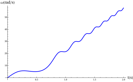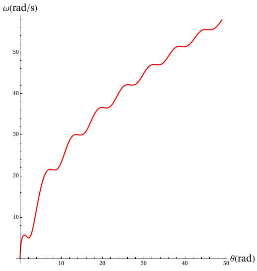 Παρατηρούμε ότι η επιτάχυνση μηδενίζεται για πρώτη φορά όταν θ=π/3. Τότε η γωνιακή ταχύτητα (άρα και η κινητική ενέργεια) της δοκού εμφανίζει το πρώτο τοπικό μέγιστο. . . Aυτό φαίνεται στο επόμενο διάγραμμα ω-t