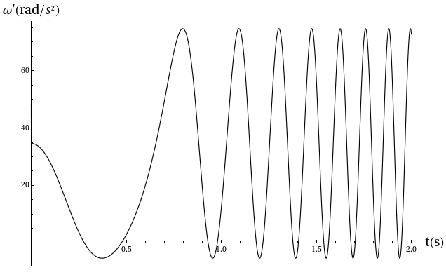Η γωνιακή επιτάχυνση συναρτήσει του χρόνου για τα πρώτα 2 sec. Μετράμε 16 μηδενισμούς της επιτάχυνσης που αντιστοιχούν στα 8 τοπικά μέγιστα και 8 τοπικά ελάχιστα του προηγούμενου διαγράμματος