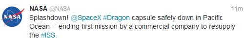 Ο «Δράκος» αναχώρησε από τον Διεθνή Διαστημικό Σταθμό έχοντας κατακτήσει τον τίτλο του πρώτου ιδιωτικού διαστημόπλοιου που παρέδωσε προμήθειες στο διαστημικό σταθμό. Η ΝΑΣΑ έχει έρθει σε συμφωνία με διάφορες ιδιωτικές εταιρείες για να αναλάβουν τα καθήκοντα του διαστημικού στόλου που παρόπλισε πρόσφατα. Οι ιδιωτικές εταιρείες έχουν αναλάβει να μεταφέρουν αρχικά προμήθειες και στην συνέχεια πληρώματα στο Διαστημικό Σταθμό.