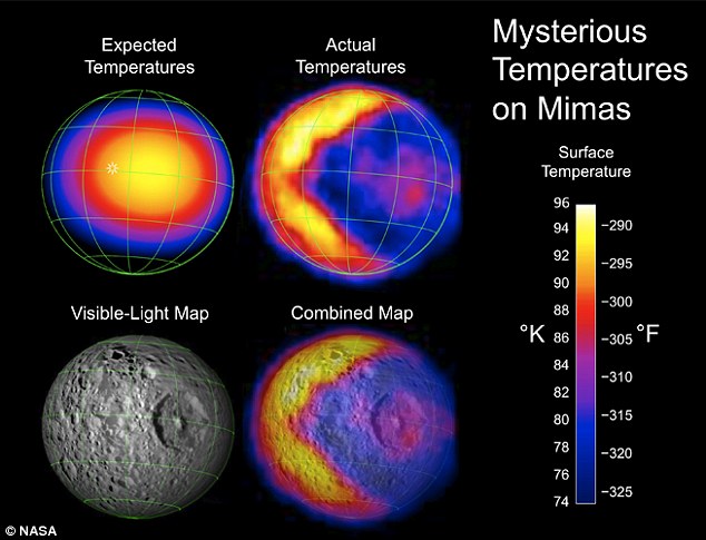 Ενδιαφέρον παρουσιάζει και ο χάρτης θερμοκρασίας του παγωμένου δορυφόρου Μίμα που δημιουργήθηκε από τα δεδομένα του διαστημικού σκάφους Cassini.