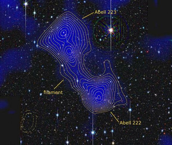Ερευνητές από τις ΗΠΑ και τη Γερμανία χρησιμοποιώντας το διαστημικό τηλεσκόπιο XMM-Newton εντόπισαν ένα νήμα σκοτεινής ύλης το οποίο συνδέει δύο μεγάλα γαλαξιακά σμήνη, το Abell 222 και το Abell 223, που βρίσκονται σε απόσταση 2.7 δισ. ετών φωτός από εμάς.