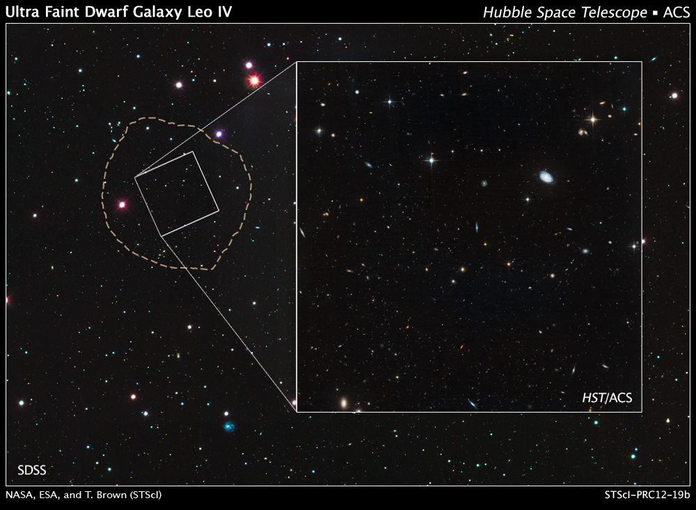 Αυτές οι εικόνες προέρχονται από το διαστημικό τηλεσκόπιο Hubble και δείχνουν τον νάνο γαλαξία Leo IV (Λέοντα IV) που περιέχει ελάχιστα άστρα. Η εικόνα στα αριστερά δείχνει ένα μέρος του γαλαξία που ορίζεται από τo λευκό ορθογώνιο κουτί με διαστάσεις 83 X 163 έτη φωτός. Τα λίγα άστρα στον Leo IV xάνονται ανάμεσα στα γειτονικά άστρα και τους μακρινούς γαλαξίες. Στο μέσον της εικόνας βλέπουμε ένα κοντινό πλάνο των γαλαξιών υποβάθρου, ενώ η εικόνα δεξιά δείχνει μόνο τα άστρα του Λέοντα IV. Ο γαλαξίας αυτός, που περιέχει αρκετές χιλιάδες άστρα, αποτελείται από άστρα όπως ο ήλιος μας, ερυθρούς νάνους πιο αμυδρούς από τον ήλιο και μερικούς ερυθρούς γίγαντες πολύ λαμπρότερους από τον ήλιο. Credit: NASA, ESA, and T. Brown (STScI)