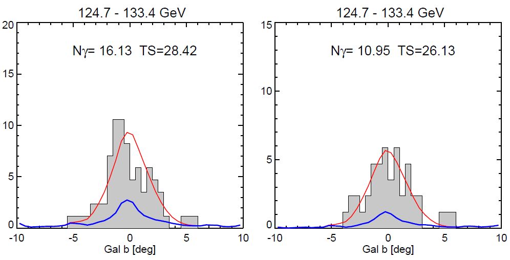 Ο Weniger αναφέρεται σε σωματίδια σκοτεινής ύλης με μάζα 130 ± 2 GeV που εξαϋλώνονται προς 2 φωτόνια (ή με μάζα περίπου 145 GeV που μετατρέπονται ένα φωτόνιο ή ένα Z μποζόνιο, ή ~ 155 GeV, προς φωτόνιο + σωματίδιο Higgs) (διαβάστε σχετικά ΕΔΩ: Ανιχνεύθηκε σκοτεινή ύλη στο κέντρο του Γαλαξία;)