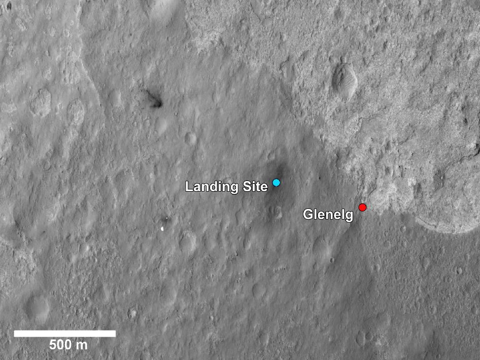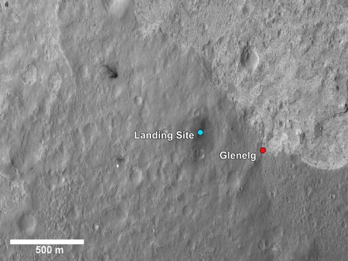 To σημείο προσγείωσης του ρόβερ Curiosity της NASA και ο πρώτος κοντινός προορισμός του, το Glenelg, σε απόσταση 400 μέτρων