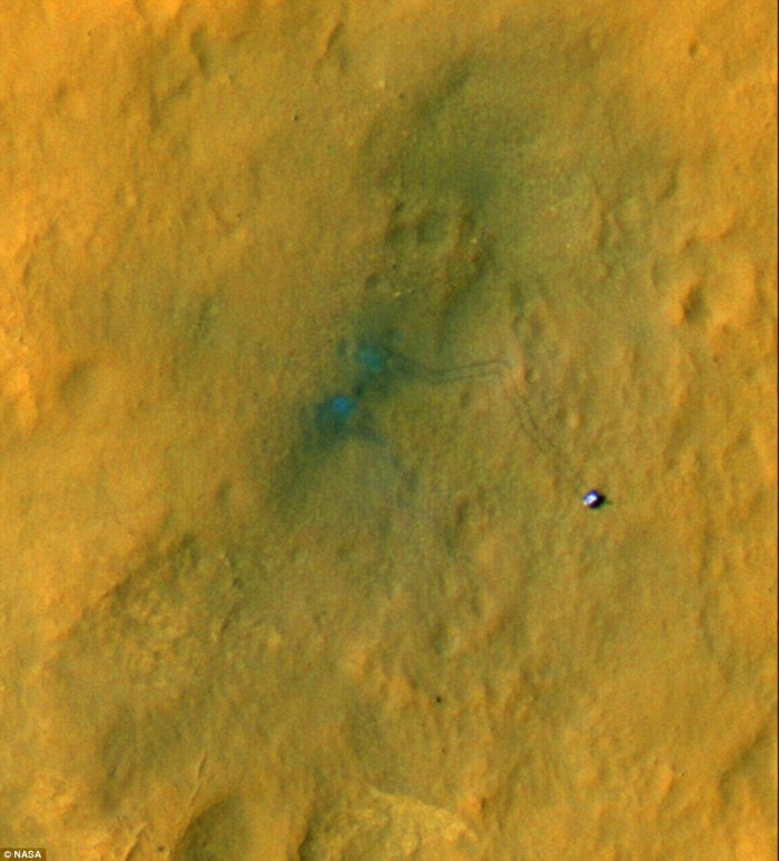 To Curiosity κινείται πράγματι πάνω στην επιφάνεια του Άρη! Απόδειξη αποτελούν οι εικόνες από την κάμερα HiRISE του διαστημικού σκάφους ΜRO (Mars Reconnaissance Orbiter) που βρίσκεται σε τροχιά γύρω από τον Άρη. Προσέξτε τα ίχνη των τροχών καθώς επίσης και την περιοχή προσγείωσης του ρόβερ Curiosity.