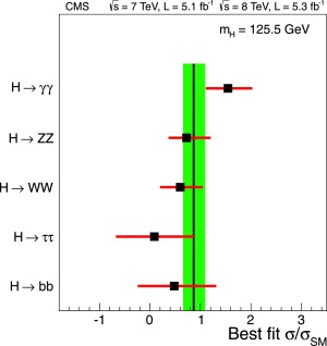To πρώτο σφάλμα είναι στατιστικό και το δεύτερο συστηματικό.«Observation of a new boson at a mass of 125 GeV with the CMS experiment at the LHC (Παρατήρηση ενός νέου μποζονίου με μάζα 125 GeV με το πείραμα CMS στον LHC)», Physics Letters B, Volume 716, Issue 1, 17 September 2012, Pages 30–61