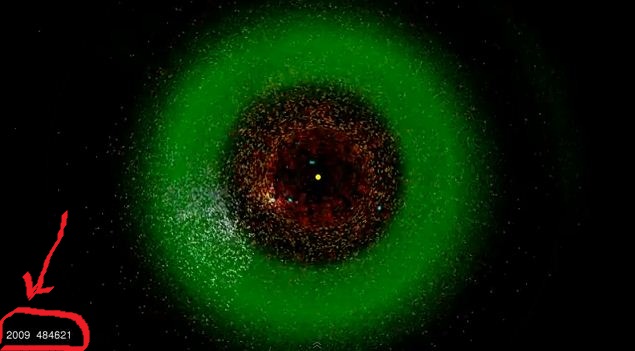 Καθώς το βίντεο πλησιάζει χρονικά το 2012 βλέπουμε στην κάτω αριστερή γωνία έναν τρομακτικό αριθμό αστεροειδών (588992). Μάλιστα ο αριθμός των ανακαλυφθέντων αστεροειδών αυξάνεται ραγδαία κατά το 2010, εξαιτίας των υπέρυθρων δυνατοτήτων του διαστημικού σκάφους της NASA, WISE.