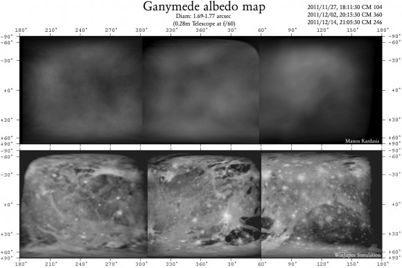 Οι αρχικές παρατηρήσεις (πάνω) και η ερμηνεία τους (κάτω) από τον πρώτο ερασιτεχνικό χάρτη ανακλαστικότητας του Γανυμήδη