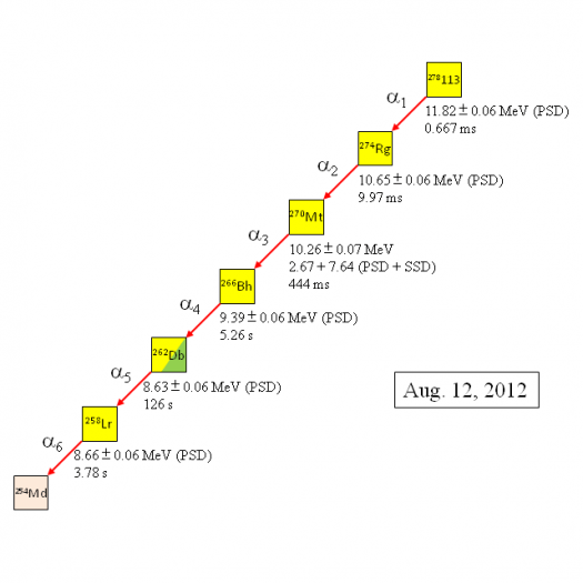 Για να δημιουργήσουν το στοιχείο 113, οι Ιάπωνες ερευνητές προκάλεσαν σύγκρουση πυρήνων ψευδαργύρου (με 30 πρωτόνια ο καθένας) με ένα λεπτό στρώμα βισμουθίου (με 83 πρωτόνια). Αμέσως μετά τη φευγαλέα δημιουργία του, το στοιχείο 113 αποσυντέθηκε, καθώς απέβαλε σωματίδια άλφα που περιέχουν το καθένα δύο πρωτόνια και δύο νετρόνια. Αυτή η διαδικασία επαναλήφθηκε έξι φορές, με συνέπεια το στοιχείο 113 σταδιακά να μετατραπεί στα ελαφρύτερα στοιχεία 109, 107, 105, 103 και, τελικά, το 101.