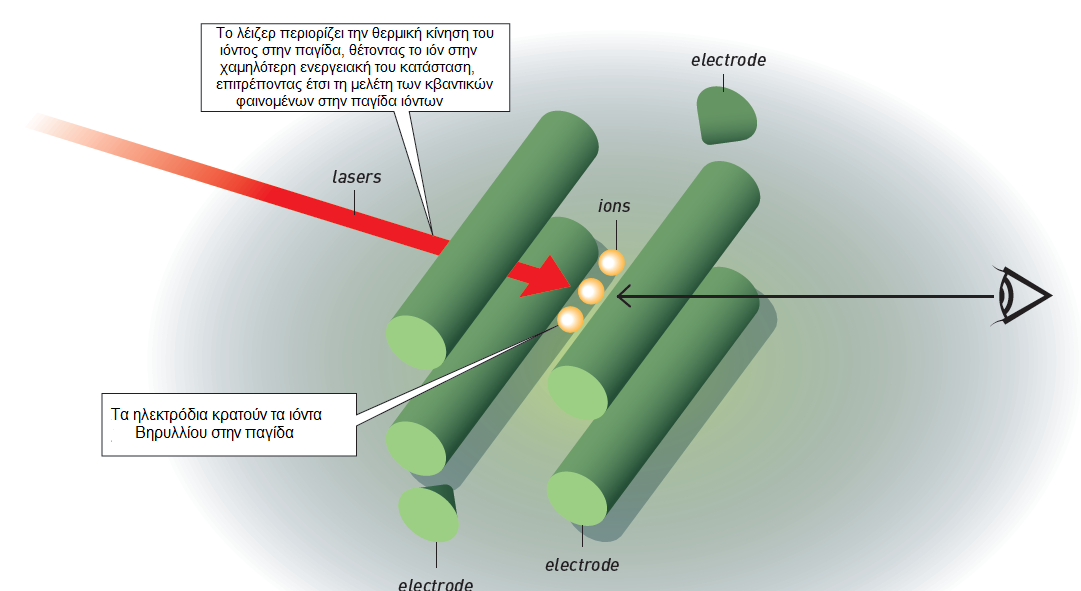 Στο εργαστήριο του David Wineland στο Boulder του Colorado, ιόντα διατηρούνται μέσα σε μια παγίδα με τη χρήση κατάλληλων ηλεκτρικών πεδίων. Ένα λέιζερ χρησιμοποιείται για να θέσει το ιόν στη χαμηλότερη ενεργειακή του κατάσταση και επιτρέποντας έτσι τη μελέτη κβαντικών φαινομένων με το παγιδευμένο ιόν.