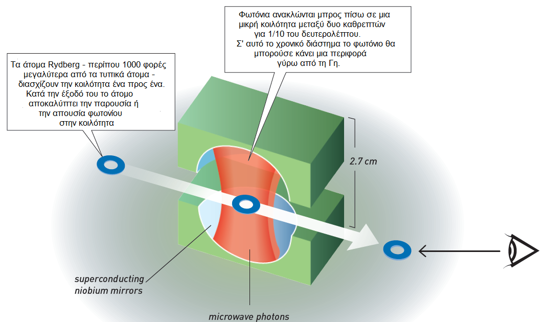 Στο εργαστήριο του Serge Haroche στο Παρίσι, σε συνθήκες κενού και σε μια θερμοκρασία σχεδόν στο απόλυτο μηδέν, τα φωτόνια με μικροκυματική συχνότητα ανακλώνται συνεχώς μπρος πίσω σε μια μικρή κοιλότητα μεταξύ δυο –σχεδόν τέλειων – κατόπτρων.
