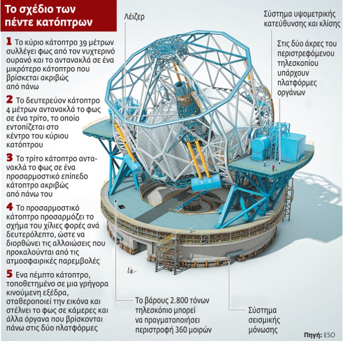 Το «τέρας» των τηλεσκοπίων ως προς τα οπτικά μήκη κύματος θα διαθέτει πέντε βασικά κάτοπτρα από τα οποία το μεγαλύτερο θα έχει διάμετρο 39 μ., τη στιγμή που άλλα έχουν διάμετρο μόλις 10 μ. «Καταλαβαίνετε λοιπόν ότι πρόκειται για ένα τεράστιο βήμα. Αυτό που μετρά κάποιος σε ένα τηλεσκόπιο είναι το πόσο μεγάλο είναι το κύριο κάτοπτρο. Τα τηλεσκόπια που λειτουργούν τώρα στα οπτικά μήκη κύματος που έχουμε ως ESO έχουν μια επιφάνεια 50 τ.μ. το καθένα και έχουμε τέσσερα τέτοια» αναφέρει ο έλληνας αστρονόμος.