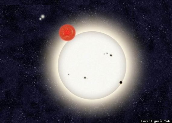 Ο πλανήτης PH1 διακρίνεται ως σκοτεινή κουκκίδα μπροστά σε δύο από τα άστρα. Στο φόντο, ένα ακόμα ζευγάρι άστρων που κινείται σε τροχιά γύρω από το πρώτο (καλλιτεχνική απεικόνιση: Haven Giguere/Yale)