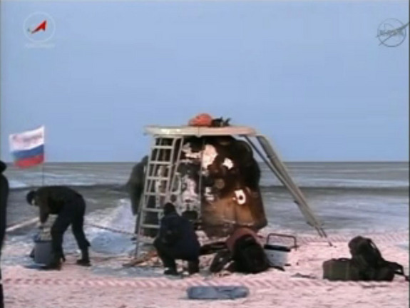 Στη στέπα του Καζακστάν προσγειώθηκε νωρίς σήμερα το πρωί η διαστημική κάψουλα Σογιούζ που μετέφερε τρεις αστροναύτες, ύστερα από την σχεδόν τετράμηνη αποστολή τους στο Διεθνή Διαστημικό Σταθμό.