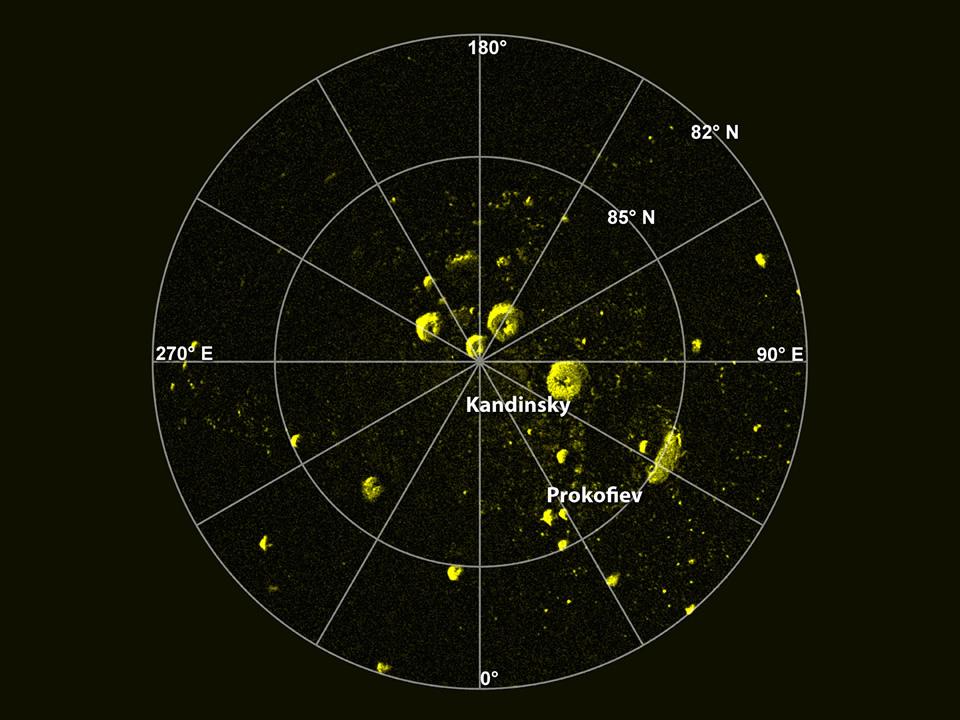 Μια εικόνα του ραντάρ βόρεια πολική περιοχή του Ερμή που αποκτήθηκαν από το παρατηρητήριο Arecibo. Κίτρινο περιοχές υποδηλώνουν περιοχές με υψηλή ανακλαστικότητα ραντάρ. Από την ανακάλυψή τους το 1992, αυτές οι πολικές καταθέσεις διατυπωθεί η υπόθεση να αποτελούνται από πάγο νερού παγιδευτεί σε μόνιμα σκιασμένες περιοχές κοντά στο βόρειο Ερμή και νότιο πόλο, αλλά έχουν άλλες εξηγήσεις για τις πολικές καταθέσεις επίσης προταθεί.