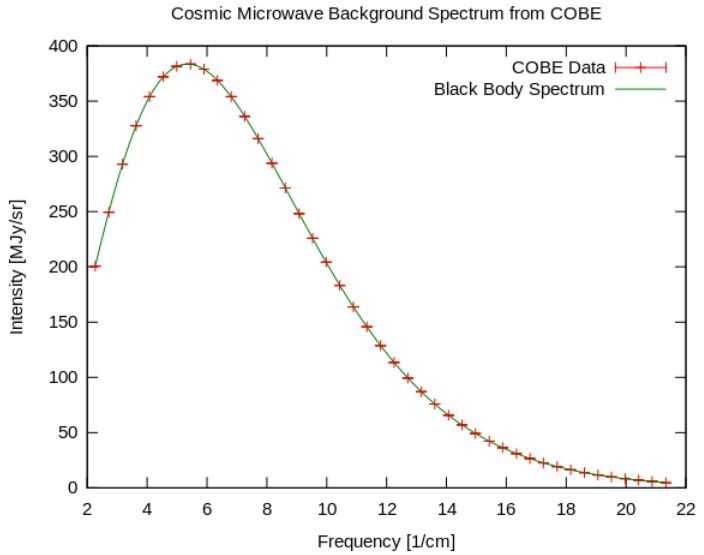 Φασματική κατανομή της κοσμικής ακτινοβολίας μικροκυμάτων. Το διάγραμμα παριστάνει τη λαμπρότητα ως συνάρτηση του μήκους κύματος της κοσμικής ακτινοβολίας μικροκυμάτων. Τα πειραματικά σημεία προέρχονται από τις μετρήσεις του ειδικού φασματομέτρου του δορυφόρου COBE (Cosmic Background Explorer) http://en.wikipedia.org/wiki/Cosmic_Background_Explorer, που εκτοξεύτηκε το Νοέμβριο του 1989. Η συνεχής καμπύλη (κατανομή ακτινοβολίας μέλανος σώματος) αποτελεί τη θεωρητική πρόβλεψη, με βάση τη κβαντική θεωρία, που αποδίδει στο φως και σωματιδιακές ιδιότητες. Η μοναδική ελεύθερη παράμετρος στη θεωρία, που καθορίζει και το σχήμα και το μέγεθος της καμπύλης, είναι η θερμοκρασία Τ. Στην προκειμένη περίπτωση Τ = 2,725 Κ, σε συμφωνία με το ισχύον κοσμολογικό μοντέλο. Η εντυπωσιακή αυτή σύμπτωση των παρατηρησιακών δεδομένων (που αφορούν το Σύμπαν και την Ιστορία του με τα πιο θεμελιακά αποτελέσματα δημιουργεί συγκλονιστικά αισθήμτα δέους και θαυμασμού για την εμβέλεια της επιστημονικής μεθοδολογίας και τη δύναμη της ανθρώπινης διάνοιας.