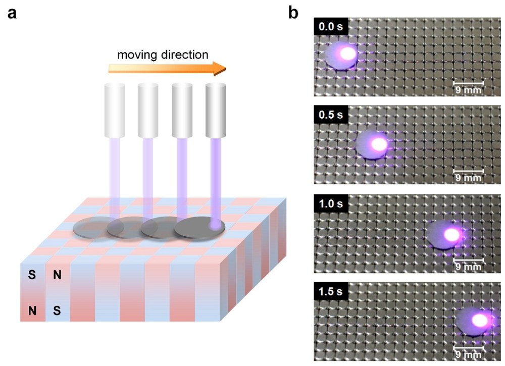 (Α) Η πειραματική διάταξη συνίσταται από ένα δίσκο γραφίτη διαμέτρου 3 χιλιοστών που αιωρείται πάνω από μαγνήτη NdFeB (Β) Ένα laser μετακινεί το δίσκο προς την κατεύθυνση της δέσμης φωτός (φωτογραφικά καρέ από το βίντεο παρακάτω)