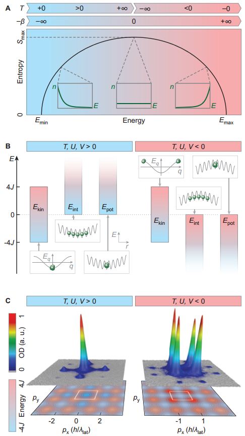 (Α) Διάγραμμα της εντροπίας ως συνάρτηση της ενέργειας σε μια κανονική συλλογή. Τίθεται άνω (Εmin) και κάτω όριο (Εmax) στην ενέργεια. (Β) Ενεργειακά όρια για τους τρεις όρους της δισδιάστατης Χαμιλτονιανής Bose-Hubbard: κινητική ενέργεια (Εkin), ενέργεια αλληλεπίδρασης (Eint) και δυναμική ενέργεια (Εpot) (C) Οι κατανομές ορμής που μετρήθηκαν για θετικές (αριστερά) και αρνητικές (δεξιά) θερμοκρασίες.