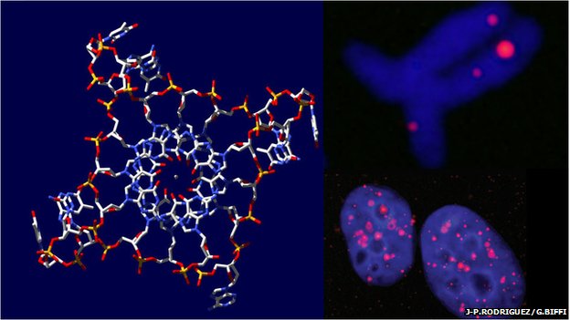 Δεξιά: φθορίζοντες δείκτες αποκαλύπτουν την παρουσία των τετραπλών αυτών δομών σε ανθρώπινα κύτταρα