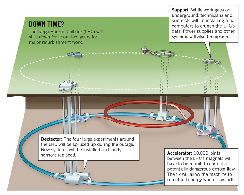 Λίγους μήνες μετά την ιστορική ανακάλυψη ενός σωματιδίου που θα μπορούσε να είναι το μποζόνιο του Χιγκς, ο Μεγάλος Επιταχυντής Αδρονίων (LHC) πρόκειται να τεθεί εκτός λειτουργίας στις 11 Φεβρουαρίου, προκειμένου να πραγματοποιηθούν εργασίες αναβάθμισης που θα διαρκέσουν δύο χρόνια. Το γιγάντιο μηχάνημα θα επιστρέψει το 2015 πιο ισχυρό από ποτέ.