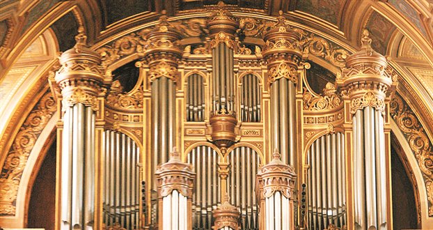 Το εκκλησιαστικό όργανο στον καθεδρικό ναό της γαλλικής πόλης Rennes.Οι βαρύτεροι τόνοι του οργάνου απαιτούν σωλήνες μήκους 10 μέτρων ανοικτούς και στα δύο άκρα