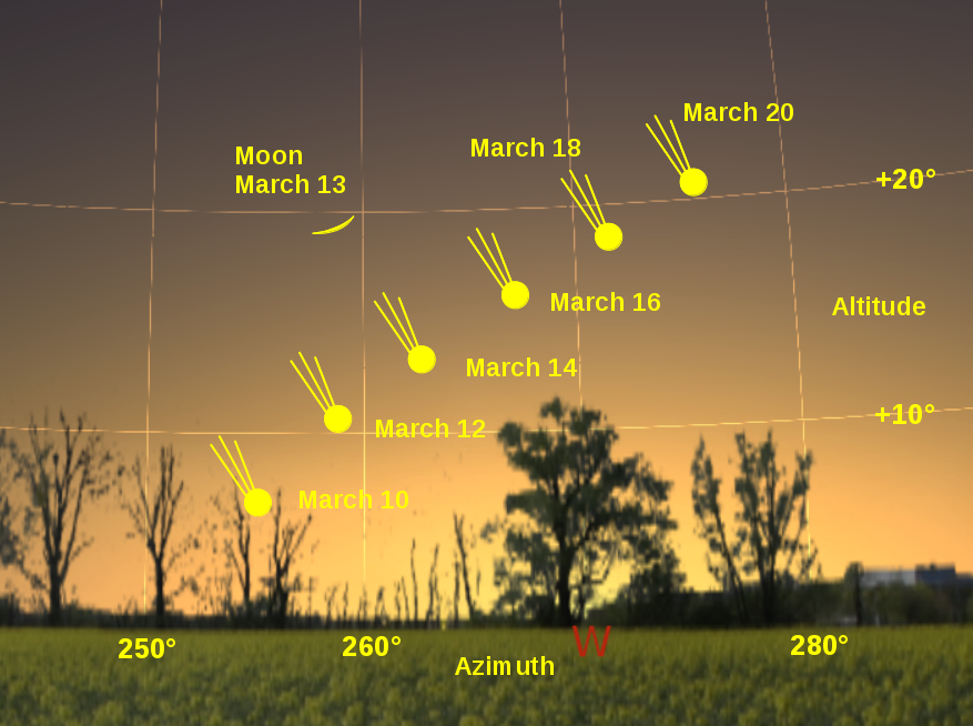Οι καλύτερες ημέρες για να τον παρατηρήσετε είναι σύμφωνα με τους ειδικούς η 12η και η 13η Μαρτίου, όταν – οπτικά – θα βρίσκεται κοντά στη νέα Σελήνη προσφέροντας έτσι ένα «σημάδι» για να μπορέσετε να τον εντοπίσετε στον ορίζοντα. Στη συνέχεια θα εξακολουθήσει να είναι ορατός (πάντα με κάποιο «μικρό» βοήθημα όπως τα κιάλια ή ένα ερασιτεχνικό τηλεσκόπιο) καθ’ όλη τη διάρκεια του μήνα και στις αρχές του επομένου.